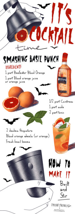 To celebrate Halloween I animated a Beefeater cocktail recipe. The cocktail is called Smushing Basil Punch made using Blood Orange Beefeater gin. I took the recipe from the Beefeater website and I created a theme of Vampires. Illustrations were created using Adobe Photoshop and animated in After Effects. The result is fun and the cocktail is amazing.